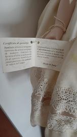 Elegante bambola da collezione con vestito in pizzo color crema, dettagli raffinati e capelli ricci castano chiaro. Occhi verdi dipinti a mano e cartellino originale ancora attaccato. Perfetta per collezionisti o decorazione in stile retrò.