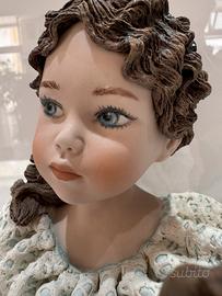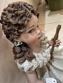 raffigurante una giovane ragazza seduta con le gambe di lato su una base circolare. Indossa un abito in pizzo bianco e azzurro chiaro dal bavero arricciato, porta i capelli legati con un fiocco bianco in una coda sulla spalla e tiene in mano un flauto.