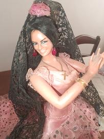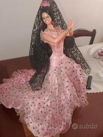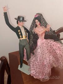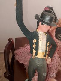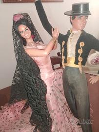 La bambola femminile indossa un abito rosa con pois neri e un tradizionale velo in pizzo nero (mantiglia). La bambola maschile è vestita con un abito da torero o ballerino, completo di cappello(una parte) Questi oggetti sono tipici souvenir spagnoli o articoli da esposizione costo 27 ciascuno per la coppia c'è uno sconto se si è interessati