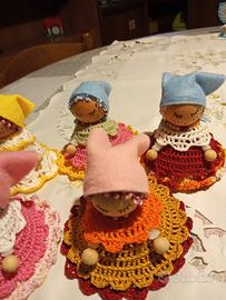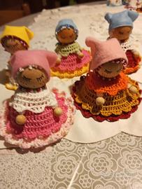 Bamboline fatte a mano all'uncinetto con fazzolettino in testa, h. 8 cm. circa.