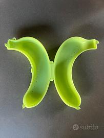 Contenitore in plastica per banane. Dotato di fori per aria e pratica chiusura.