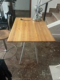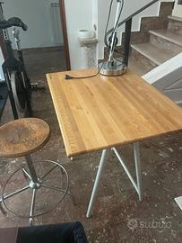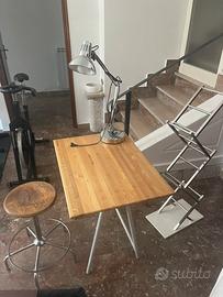 Banco da studio con sgabello, piano in legno e struttura in ferro.