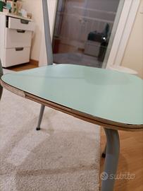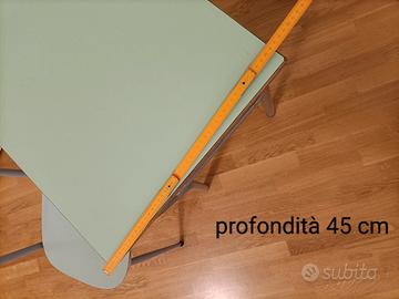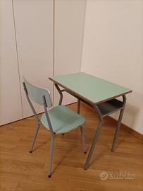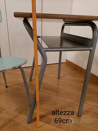 2 banchetti scuola vintage con due sedie abbinate. Le sedie hanno le gambe qualche cm più corte del normale perché sono state adattate all altezza dei banchi. Alcuni segni di usura sulle sedie (mancano alcuni tratti del bordo in metallo). Misure in foto Ritiro a Ravenna, non spedisco I prezzo è per tutto il blocco.