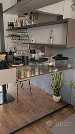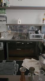 Banco servizio in materiale antigraffio, Frigo a 2 sportelli "IFI" + motore esterno. Punto cassa con cassetto, laterale con vetrina per brioches e panini. Retro in acciaio Inox, lavandino completo, mobile con cassetto per caffè, produttore ghiaccio piccolo incluso, 2 mensole muro.