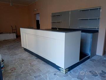 Arredamento bar da mt. 3,00 lineare con frontale sagomato, composto da: un banco con cella a 2/3 sportelli + vani neutri, retro banco con predisposizioni varie e pedana.