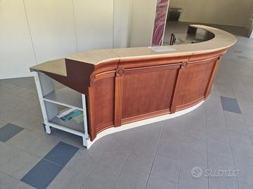 Banco curvo in legno con piano in marmo.