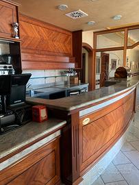 Banco bar in legno e marmo completo di ripiani per bottiglie e bicchieri di circa 4 mt e mezzo , la zona frigor anteriore ha tre ante e quattro cassetti , nel retro banco ci sono due ante frigor . Il prezzo è trattabile previa visione del bene.