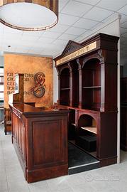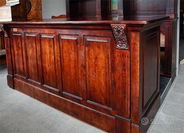 Banco bar in legno massello color mogano, intarsiato a mano, pezzo unico. Usato solo in fiera. 📏 Composto da: banco cm 270x80 con frontale lavorato e con lesene decorate. Pedana profonda cm 70. Retro cm 280x48xH285 con vetro centrale colorato, archi laterali e lesene decorate. Cielino con timpano centrale decorato. 💰 Prezzo anniversario: 6.000€ + IVA 📦 Ritiro presso la nostra sede 📩 Scrivi in privato se ti interessa!
