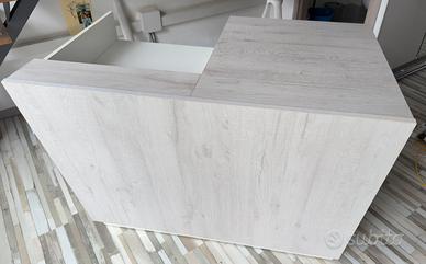 Banco cassa con cassetto a chiave per negozi commerciali. Color bianco e grigio effetto legno. Dimensioni L 121 x L 75 x h 101 cm