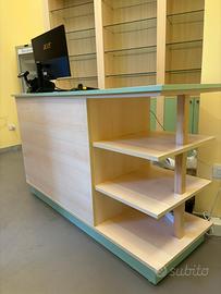 Banco da lavoro o reception in legno chiaro con dettagli verde salvia, dotato di piano ampio e scaffali laterali a vista.