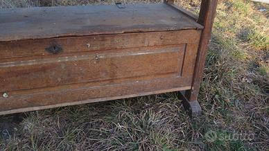 Antico banco da falegname in rovere/frassino con morse in legno e un vano portaoggetti chiuso da un'anta a ribalta. H80x207/218x58/64/76 cm. Spedisco in tutta Italia.