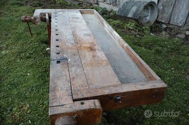 Banco da falegname in legno di faggio (piano e gambe) con doppia morsa e un cassettone centrale per riporre gli utensili. Misure: 212x95 cm + mozzi morsa. Il banco è totalmente originale.