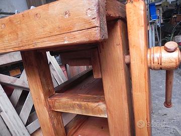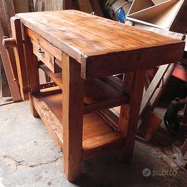 Banco da Falegname in pino massiccio Vintage restaurato pronto da usare. Ha una morsa in legno sulla sinistra, un bel cassetto al centro, un piano in basso e una tramezza.