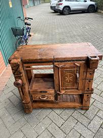 Banco da falegname intagliato a mano con vano contenitore con anta su perno di legno e cassetto porta oggetti , lo completano i rinforzi in ferro antico i porta stracci e la tasca porta scalpelli in legno!
