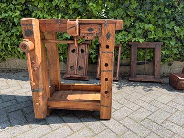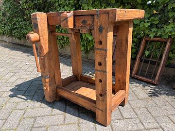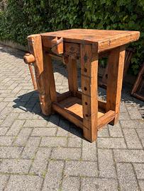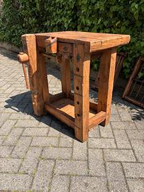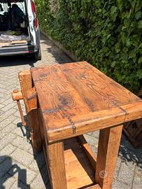 Bellissimo banco da falegname dalle piccole dimensioni con cassetto e porta stracci, morsa funzionante e tasca in legno porta scalpelli! Ottimo come top per bagno o mobile d’appoggio! Verniciato ad acqua e finito a cera naturale! Previo accordo e’ possibile il trasporto