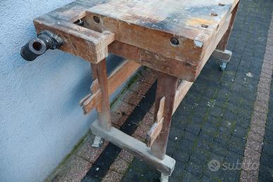 Vecchio banco da falegname da centro con due morse in legno (vite in metallo). Lungo circa 157cm e largo 52cm