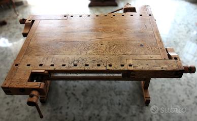Antico banco da falegname scolastico, restaurato con passione e trasformato in un tavolo dal fascino unico.