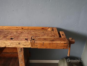 Banco da falegname antico in faggio già restaurare adatto per l’arredamento di vari ambienti. Il banco è sano, non tarlato, completo di mobiletto per gli attrezzi, un cassetto e di una morsa perfettamente funzionante. Misure in CM 218x50 – ingombro massimo compreso la morsa 230x50