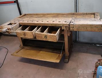 Splendido banco da falegname in faggio restaurato e completo in tutte le sue parti. Due morse in legno perfettamente funzionanti, due cassetti porta utensili e un vano chiuso da un’anta a ribalta. Dimensioni 173x61 (con morsa 184x96), alto 83cm.