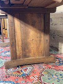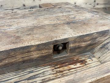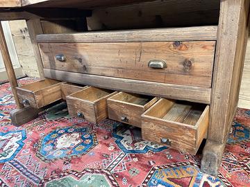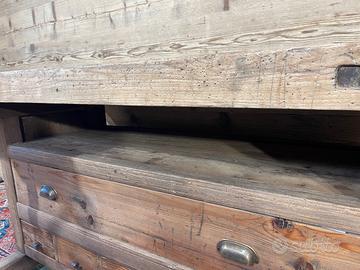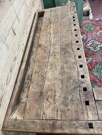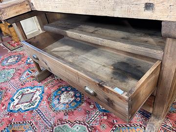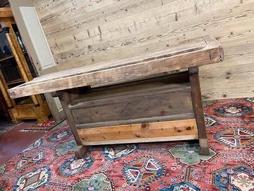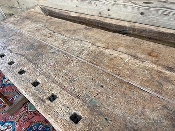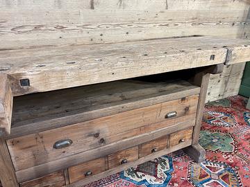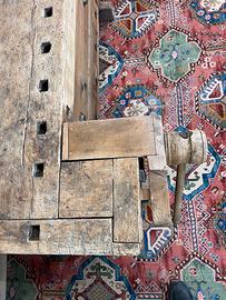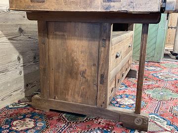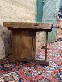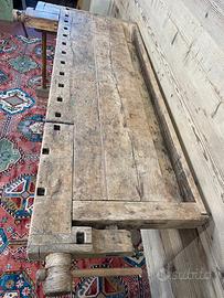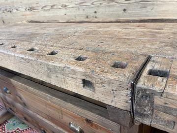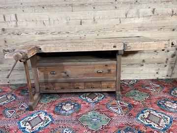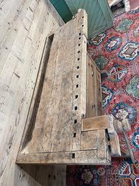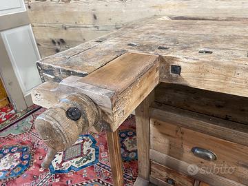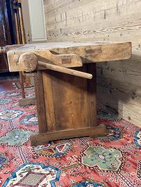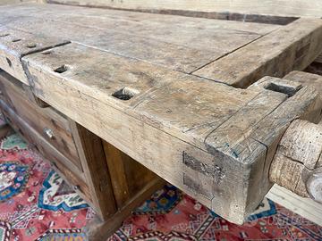 Vecchio banco da Falegname in faggio e abete , con morse in legno. Alcune parti sono state integrate o sostituite nel corso dei restauri subiti.(ad esempio, sono stati aggiunti dei cassetti vecchi).