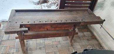 Vecchio banco da lavoro in rovere completo di due morse in legno con vite in ferro. Lungo 193cm; profondo 55cm lungo tutto il piano.