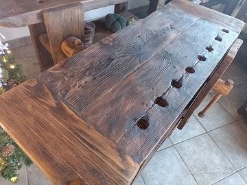 banco da falegname massiccio in legno di larice con piano spesso 10 cm coi suoi relativi buchi . robusto e fascinoso, misura 112 x 39 x 80 altezza con un totale di ingombro di 53 cm con la morsa sulla destra. trattato con impregnante e cera d'api naturale, non ha bisogno di ulteriori manutenzioni ed e' pronto per abbellire casa vostra. ulteriori info in privato.