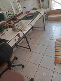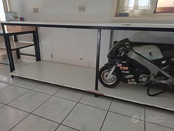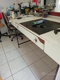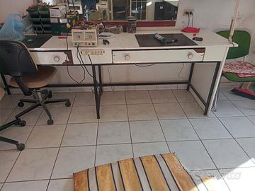 n 2 banchi da lavoro 1 lungo 3mt e l'altro 2,5mt struttura in ferro robusta, mentre il piano di lavoro è in legno e formica da 3cm .