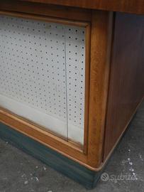 Banco da merceria bifacciale in legno di faggio con vetrina originale da un lato e 20 cassetti nel retrobanco.