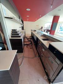 Bancone con frighi, retrobanco con accessori e pedana. Tavoli e cappa in acciaio, sgabelli, tavoli e sedie in legno/acciaio e accessori da bar (porta zucchero e porta salviette)