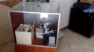 Vendo Banco/Espositore con Vetrina frontale e superiore e vano a giorno dim. L75 x P60 x H96 col. Ciliegio e Grigio alluminio. Usato e in discrete condizioni.