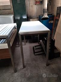Arredo da esposizione composto da n. 1 banco in acciaio inossidabile compreso di cassettone a 3 scomparti, 2 cassetti e divisori e n. 1 tavolo con struttura in acciaio inossidabile.