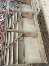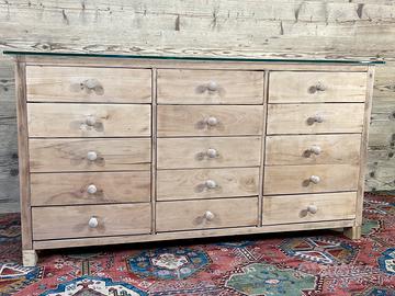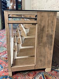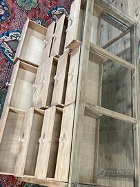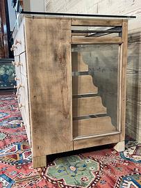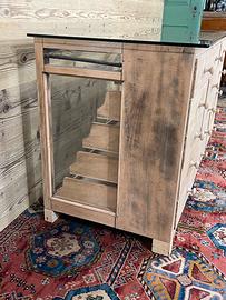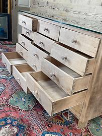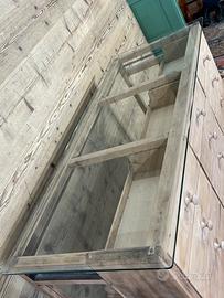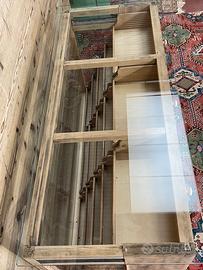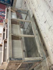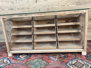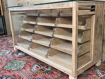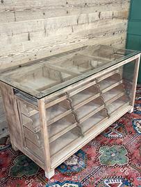 Vecchio bancone espositore, non restaurato. Alcune parti sono state integrate o sostituite durante i restauri subiti nel corso del tempo. Il piano di appoggio in vetro è stato realizzato con vetro temperato. Dimensioni di ingombro 156,5 × 65 cm ed altezza 83,5 cm. Dimensioni ingombro senza conteggiare il piano in vetro, 59 × 150 cm .