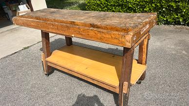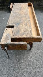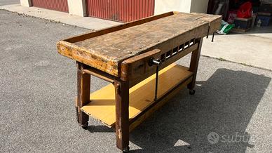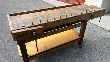 Banco da falegname anni 50 con 2 morse legno e ferro e adattatori per bloccaggio. Piano inferiore e ruote removibili, montati per praticità. Trasporto a carico dell’acquirente. Lungo 195cm,alto senza ruote 85 , profondo 80. Accetto offerte