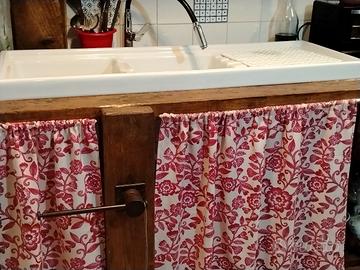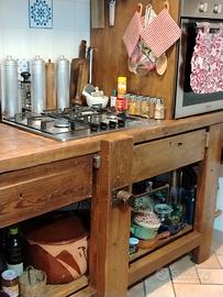 Due banchi falegname con lavello in ceramica anni 60 piano cottura e forno due morse in ferro funzionanti e due cassetti molto capienti, dim. 300x66x92h