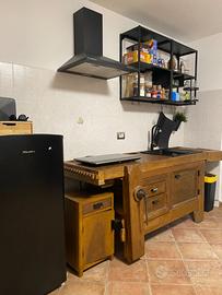 Vendesi banco falegname in legno massello trasformato in mobile cucina (2,30x84x62) corredato da mobiletto in legno (36,5x59x31), lavello, miscelatore, piano induzione d’appoggio g3 ferrari (56x36), cappa ciarra 60cm, mobiletto pensile Ikea (60x30x75) e frigo hisense (51,4x107,9x51,5). Prezzo trattabile.