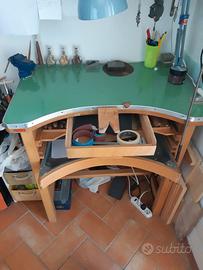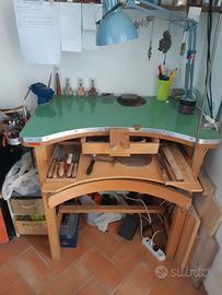 Banco orafo (NON VENDO ATTREZZI) composto da cassetto per recupero limatura, ripiano per disegnare/poggiare attrezzi, cassetto portaoggetti, zampino e poggiapiedi.
