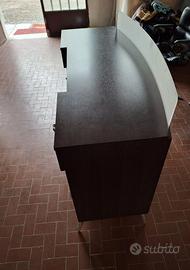 Banco cassa con frontali removibili in plexiglass satinato, ripiano superiore in laminato, cassetti e spaziosi contenitori, piedini in acciaio. Larghezza 140 cm; Profondità 50 cm; Altezza 88 cm. Ritiro a Vezzano sul Crostolo (Reggio Emilia).