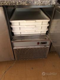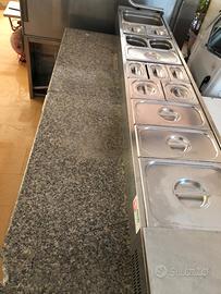 Banco pizzeria refrigerato lungo 213 cm e largo 81 cm, ha due sportelli frigo, lievitatore e 5 tiranti per i cassetti con l impasto, più porta condimenti refrigerato con 13 vaschette con coperchi