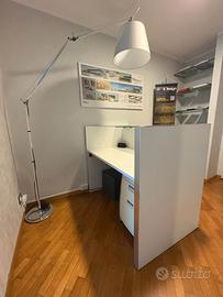 In abbinamento, cassettiera serie UNIBOX in legno, composta da 3 cassetti su ruote, con frontali, top e struttura di colore bianco.