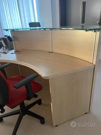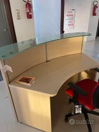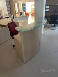 Banco reception semicurvo in finitura acero piano superiore cristallo acidato.