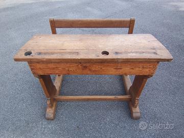 Banco scuola d'epoca in legno restaurato, sono compresi anche due calamai in vetro non visibili in foto. ( non spedisco)