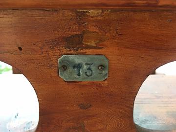 Bellissimo modello primi del 1900 con leggio doppio, ganci laterali per le borse e doppio calamaio in vetro per l’inchiostro. Lucidato e trattato con vernice da legno, in origine di colore nero. Intaglio rotondo per penne ed oggetti.