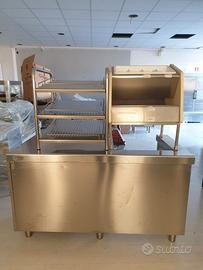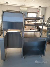 Banco cassa self service in acciaio inox con cassetto e banco self service posate, vassoi, pane in inox. Usato ma in buone condizioni. Per maggiori informazioni contattare il numero 335353960.