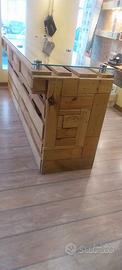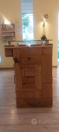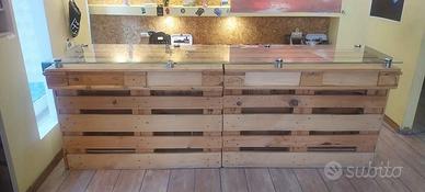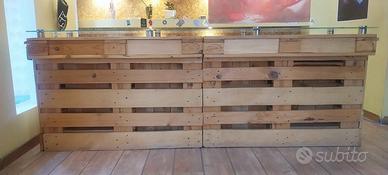 Bancone unico 240×100×60cm, realizzato a mano da falegname, con pallet EPAL lavorati a mosaico, piano in vetro e cassettoni capienti sul retro.