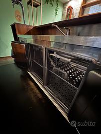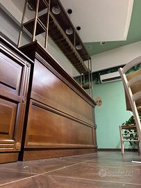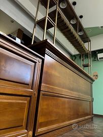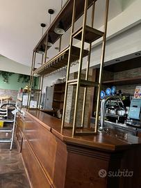 Bancone Bar in legno con frigo a tre ante e lavello, sormontato da una struttura in ferro e mensole in legno, con griglie porta calici fino a 50 calici.