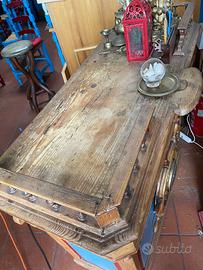 Bancone bar / accoglienza con cassetti e ripiani interni. Buono stato da restaurare in alcune parti.