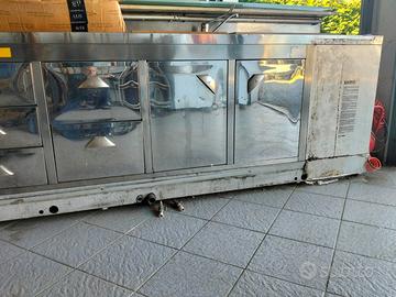 Vendo bancone bar in ottimo stato di lunghezza 2.80 con rivestimento frontale in legno come foto, lavello doppia vasca acciaio in ottimo stato con frigo sottobanco funzionante.