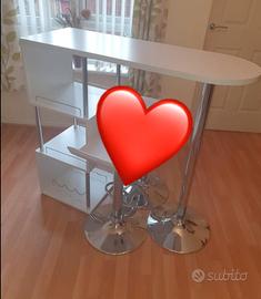 Vendo elegante bancone bar moderno colore bianco con ripiani interni portaoggetti, completo di 2 sgabelli neri regolabili in altezza.