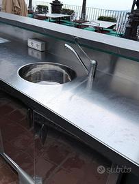 Banco bar professionale acciaio inox refrigerato su ruote, con lavandino funzionante con taniche per carico e scarico. Porte refrigerate per bottiglie, tasca porta bottiglie. In caso di spedizione il costo è da calcolare a parte.