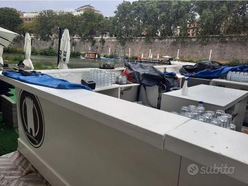 Bancone bar da esterno legno okume’ resistente ad acqua e sole Usato 2 stagioni Tot metri 18 ma sono tutti pezzi modulari da 2 metri La forma è una u